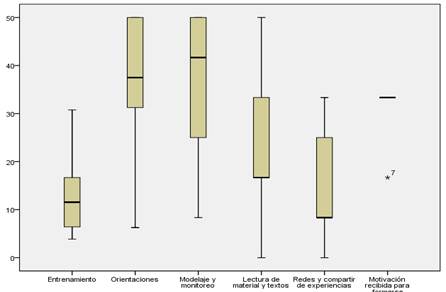La Tabla de las medianas, y el gráfico de caja y bigote de las dimensiones de formación muestran que la dimensión con el puntaje más bajo fue Redes y compartir de experiencias, con una mediana de 8,33, la cual se ubicó en la categoría deficiente, seguida por la dimensión entrenamiento (mediana de 11, 54 puntos sobre 50), también ubicada en la categoría deficiente. Las dimensiones donde el grupo de docentes obtuvo las medianas más altas fueron Modelaje y monitoreo (41,67), y Orientaciones (37,50), la primera ubicada en la categoría excelente y la segunda en la categoría suficiente.