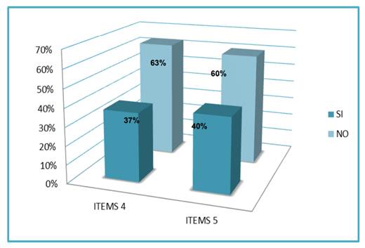 En cuanto a la dimensión Recolección selectiva, específicamente clasificación de los materiales sólidos, tipos de contenedores, se percibe una frecuencia de 63 por ciento negativa al conocer a alguien que cumpla con la clasificación de los materiales sólidos, indicando el desconocimiento en las categorizaciones de los materiales manipulados en su entorno diario, mientras que el 37 por ciento expuso afirmativamente su respuesta. De la misma manera, el ítem 5 refleja que el 60 por ciento niega estar al tanto de la simbolización conducida en su medio ambiente. Por ende, el 40 por ciento restante de los estudiantes reconocen los tipos de contenedores utilizados en el reciclaje. Estos valores se encuentran reflejados en el Gráfico 2.