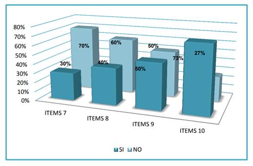 Mientras tanto, el ítems 9 refleja equidad de un 50 por ciento entre ambas respuestas en torno a la ganancias obtenidas por las ventas de productos reciclados, demostrando el interés económico. Finalmente, en el último ítem los estudiantes afirmaron con un 73 por ciento la reutilización de botellas de agua logrando un beneficio económico dentro de la institución, obteniendo como resultado un gran aporte para la comunidad; pero por el contrario el 27 por ciento indicó no creer que reutilizando las botellas de agua se logra un beneficio económico dentro de la institución.